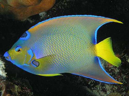 | Holacanthus ciliaris (Linnaeus 1758), the Queen Angelfish. A true queen of fishes.Full size angels should not be mixed with other full size angels, unless it is in a tank of at least 180 gallons. Like its cousin the Blue Angel, the Queen Angel is a very popular species known for its bright coloration, and hardiness. The Queen Angel is similarly shaped to the Blue Angel, but the coloration is pretty different. In the Queen Angel the yellows and blues are much brighter, and the borders are finer as well. Juveniles can be distinguished by the coloration, and the color patterns as well. Like its cousin though, the Queen Angel is not a good candidate to mix this Angel with other Angels, except in very large Aquaria. As mentioned with the Blue Angel, the Queen Angel will sometimes hybridize with its close cousin the Blue Angel. |